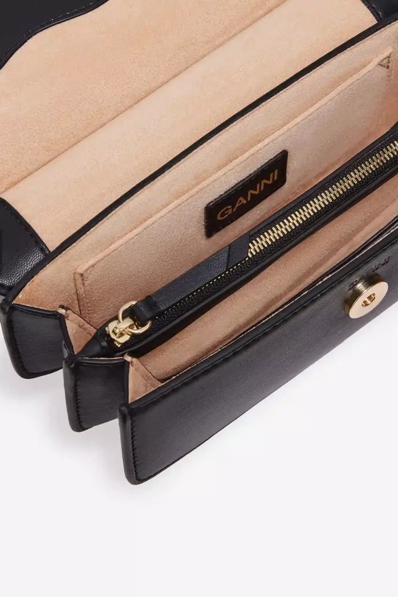 This bag features a structured silhouette, a top handle and an adjustable and removable shoulder strap. The bag has a magnetic closure with the signature GANNI Butterfly clasp in gold-