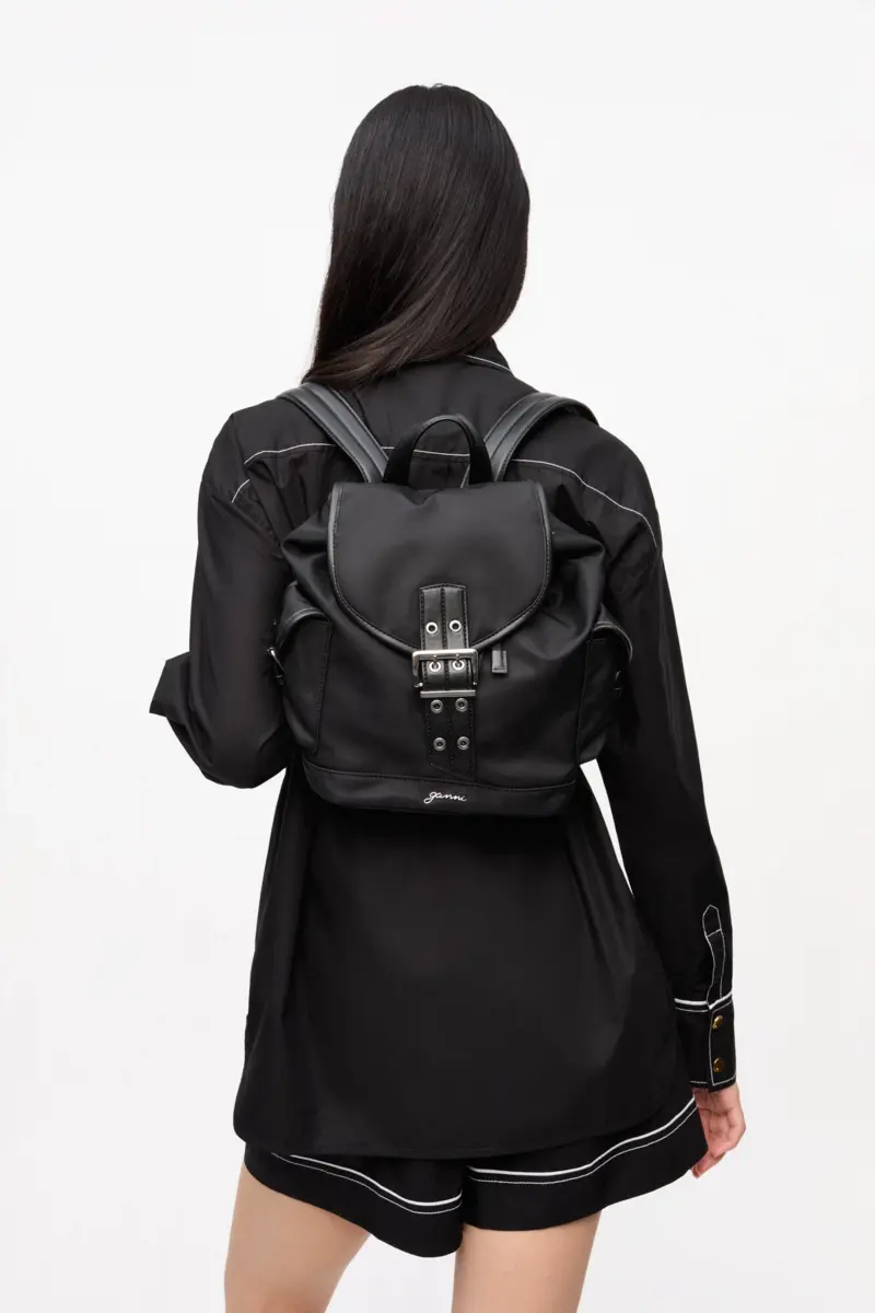 This backpack is made from recycled nylon. The backpack features a top handle, adjustable shoulder straps, a foldover top, front buckle fastenings, a drawstring closure, two side pock