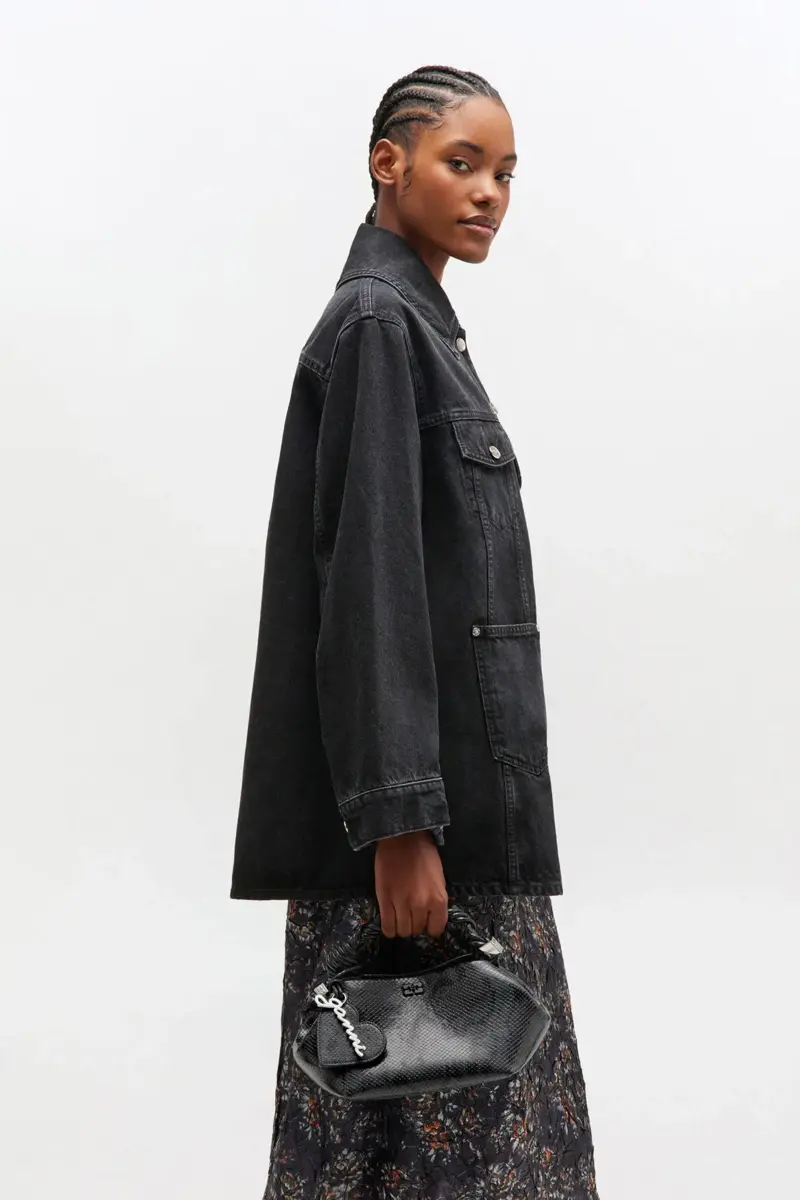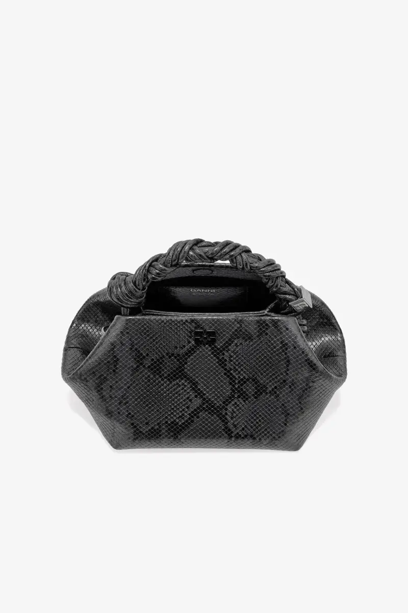 This bag features a tone-on-tone metallic GANNI Butterfly logo, a twisted handle with a braided knot, and a gold-tone metallic dice with a GANNI Butterfly logo engraved. The bag has an