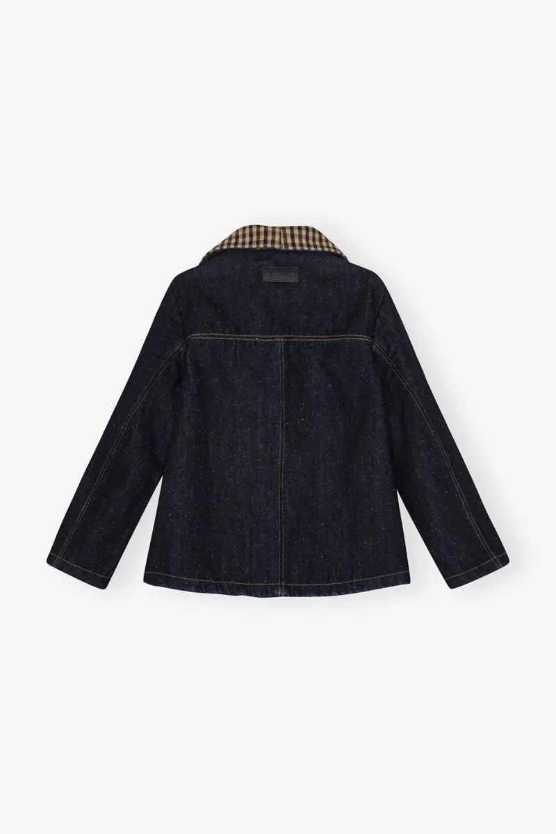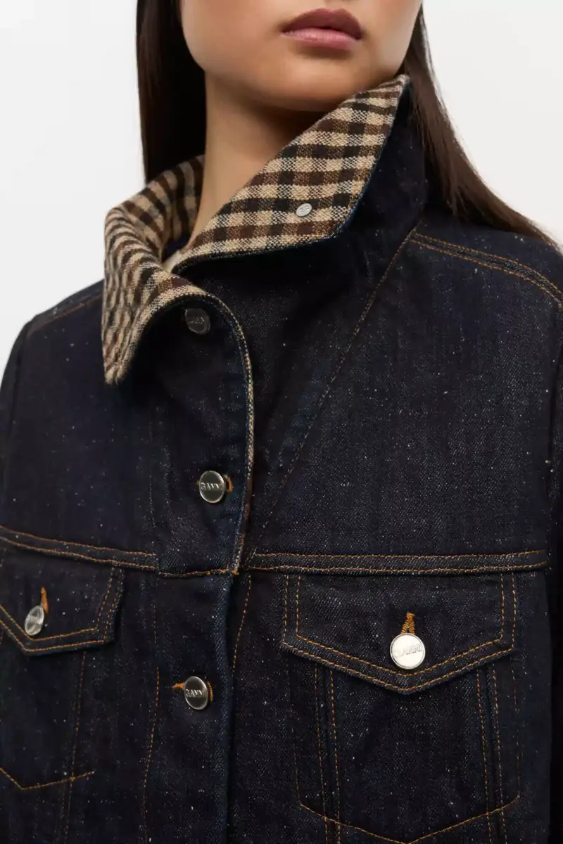 This jacket features a check print collar, button-front closure, 4 pockets and a GANNI logo patch on the back.