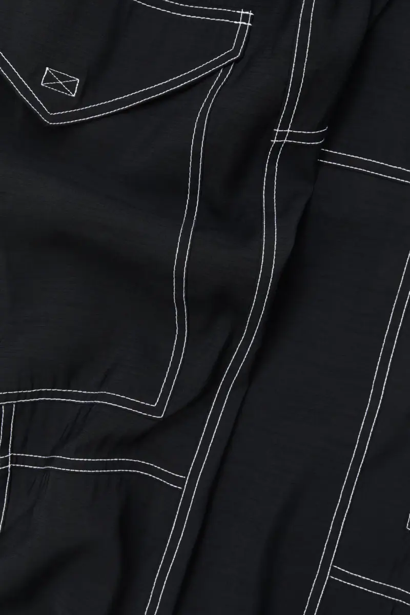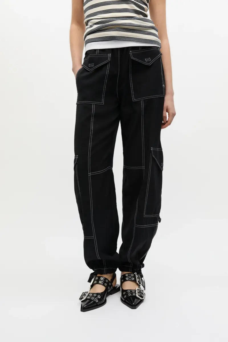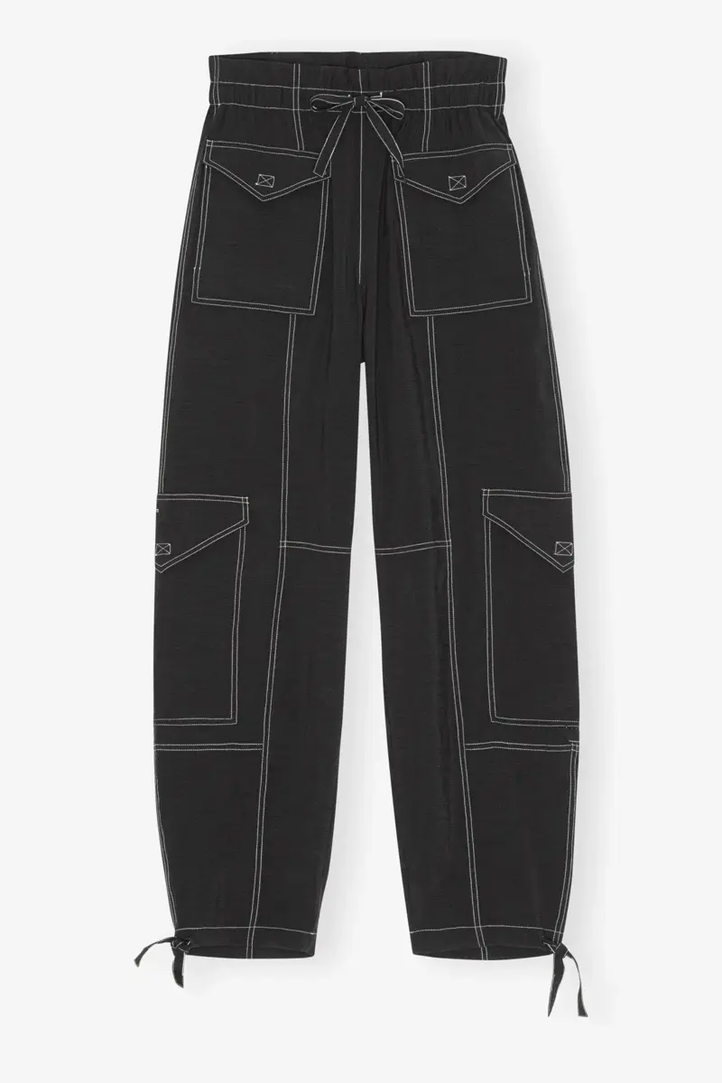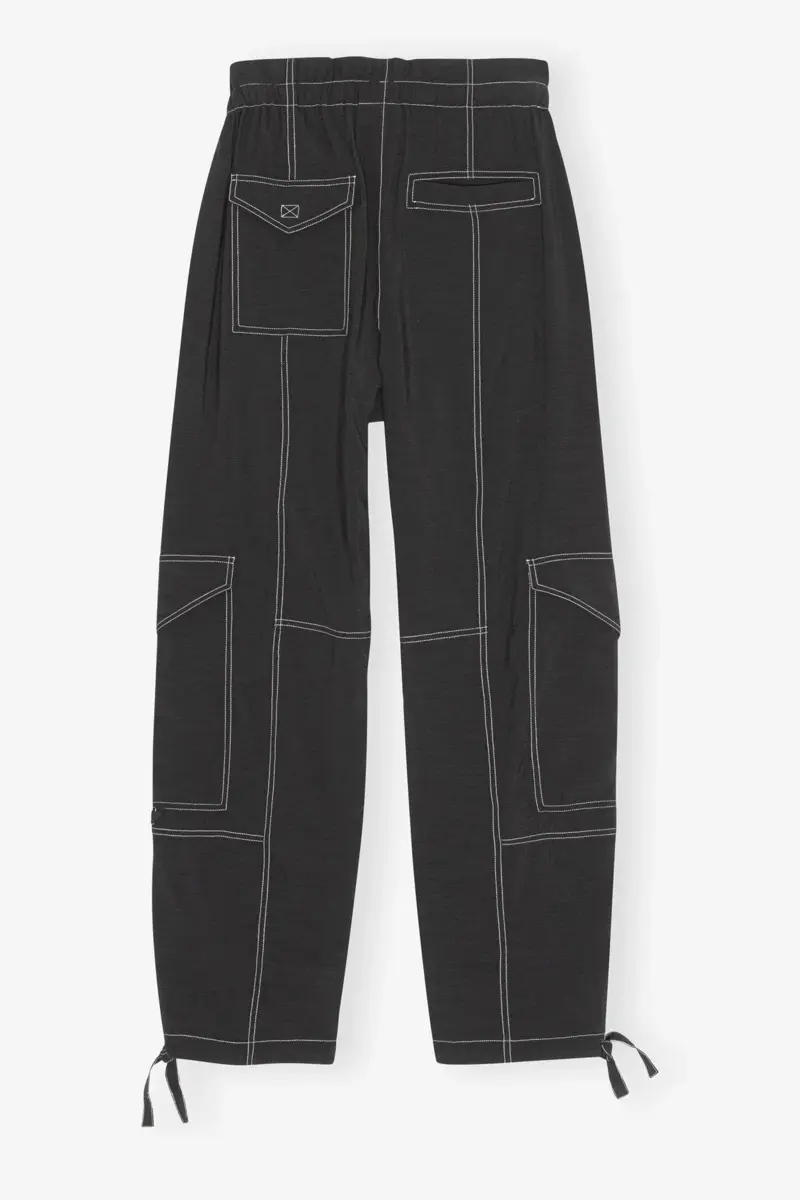 These trousers feature seam details, flap pockets, contrast stitching and a drawstring closure across the waist and ankles.