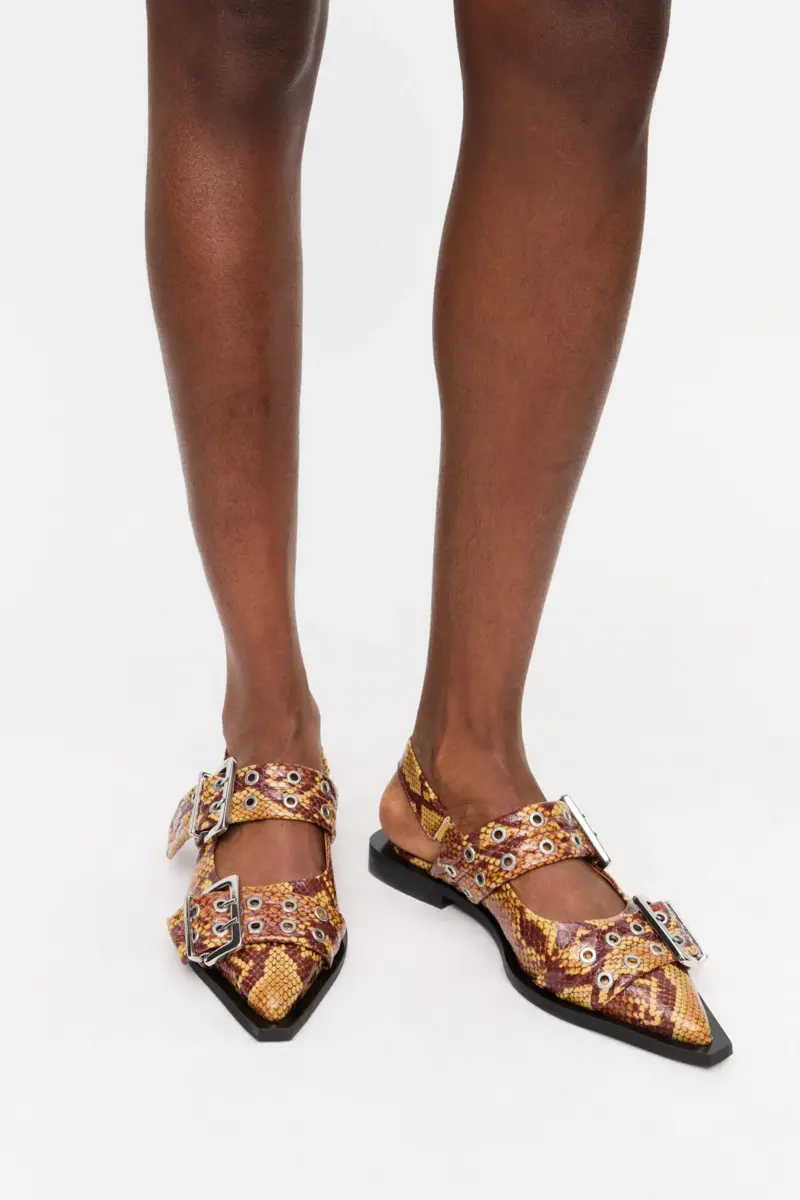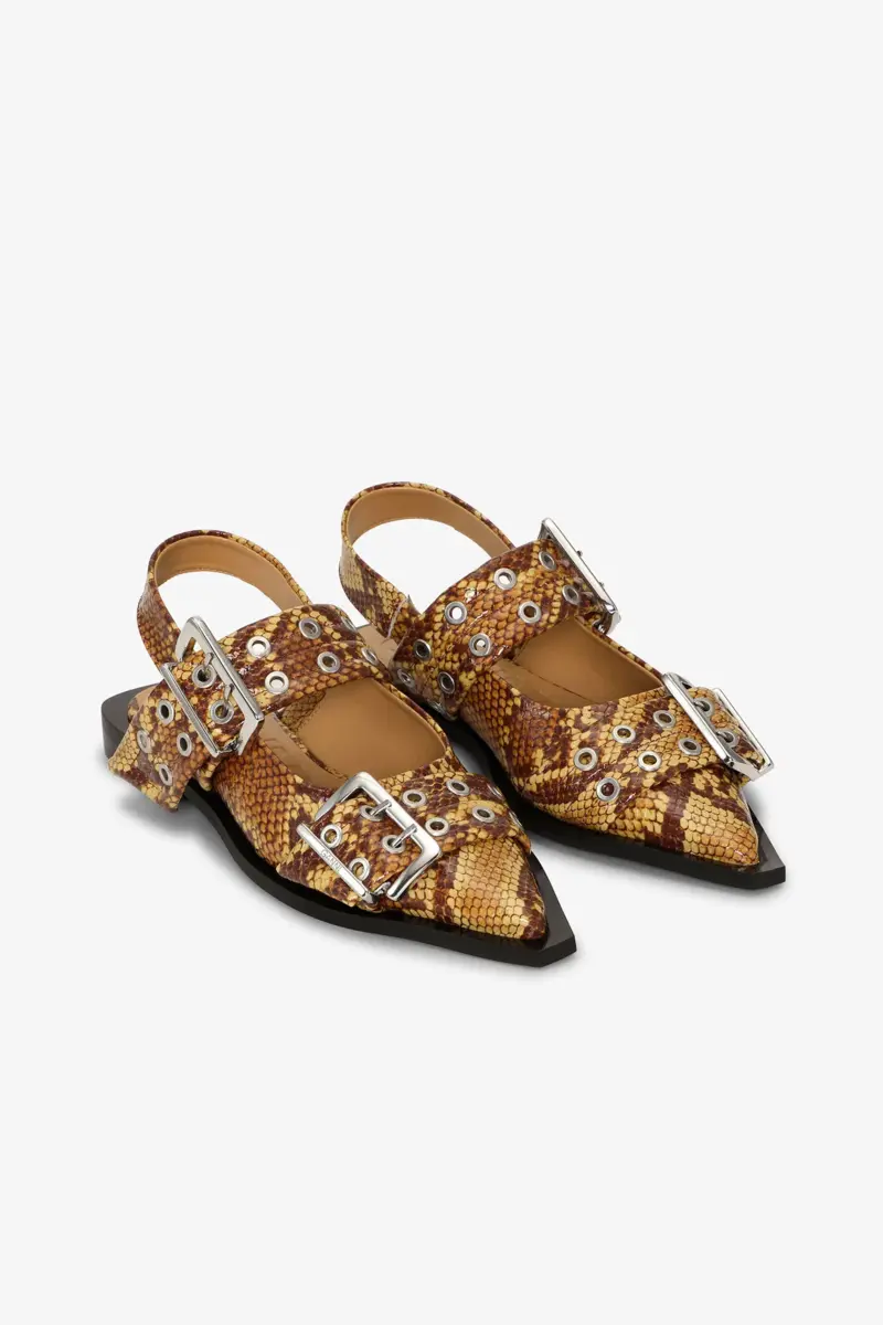 These ballerinas feature slingback straps and a pointed toe. The shoes have two silver-tone buckles with matching eyelets and a black squared block heel.